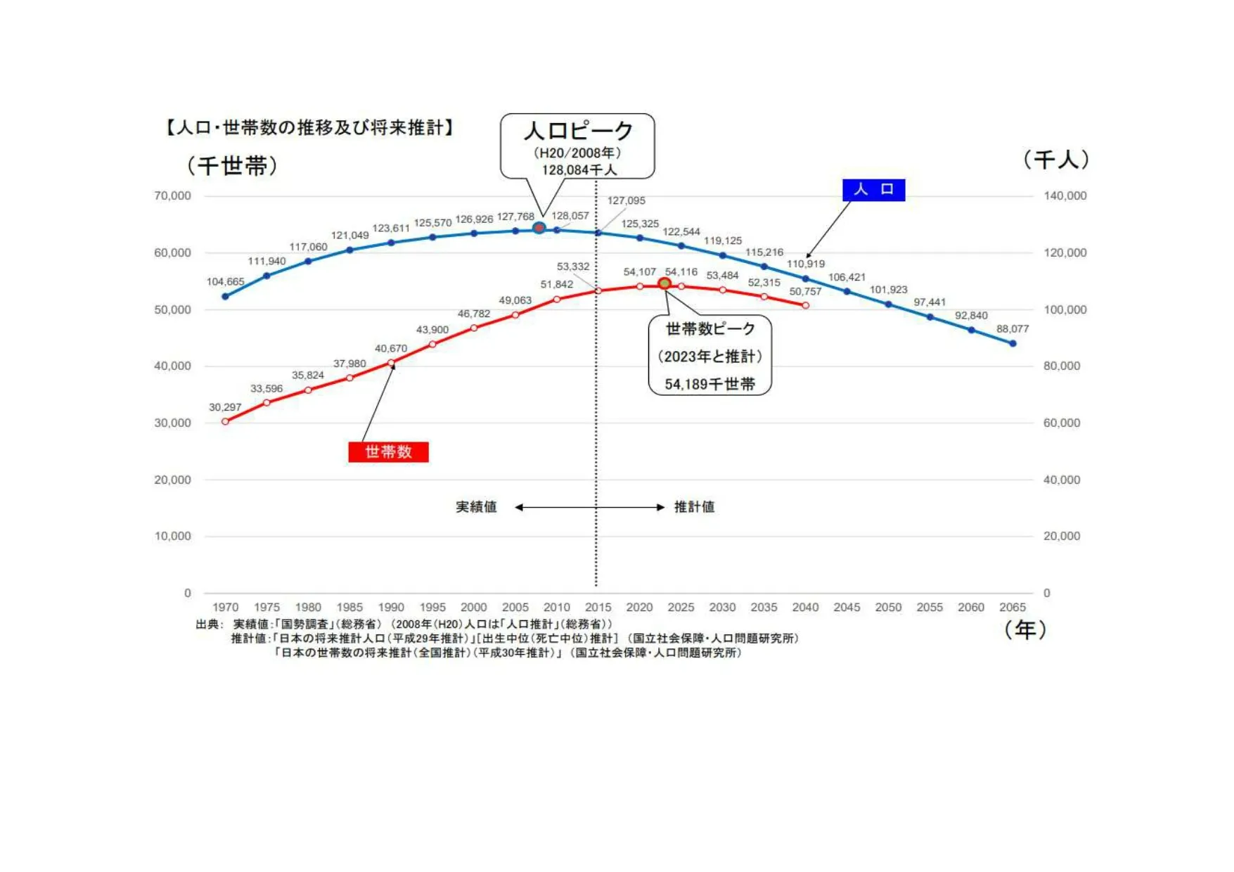 総務省の国税調査による人口と世帯数の推移 人口と世帯数の実績値と推計値の折れ線グラフを見つけました。日本の人口のピークは2008年(平成20年)でした。世帯数のピークは2023年(令和5年)と推計されていて、人口も世帯数もピークから下がり続け…